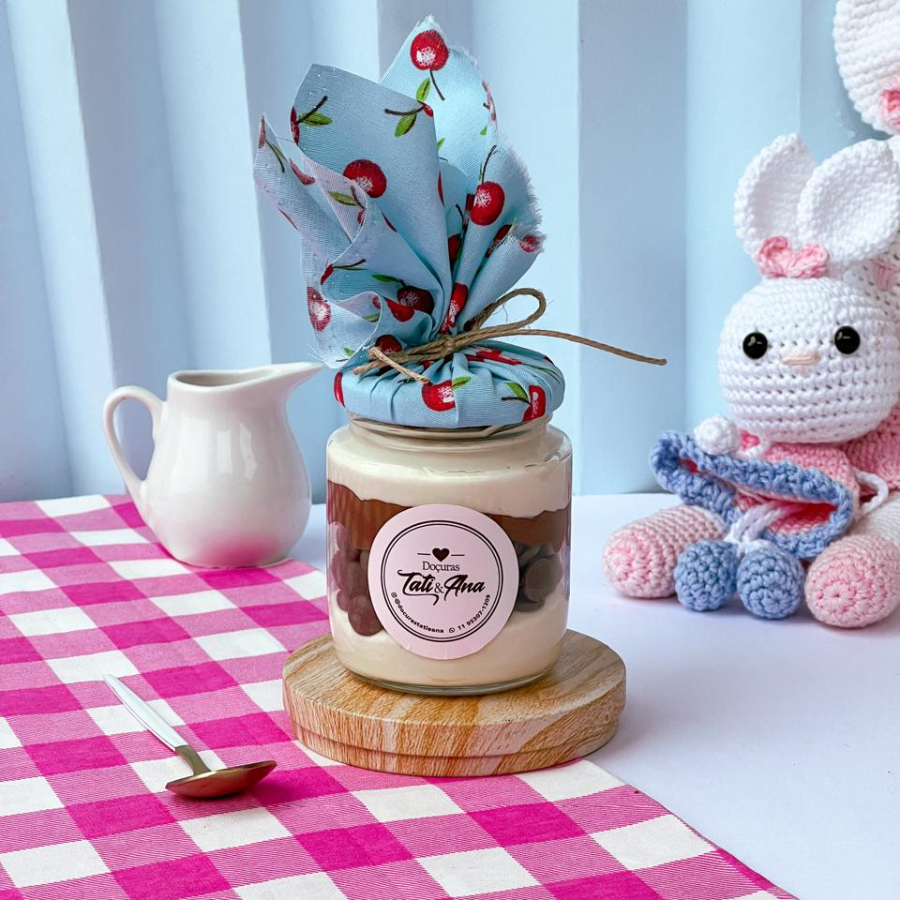 Pote de vidro com camadas de chocolate ao leite, kinder e nutella