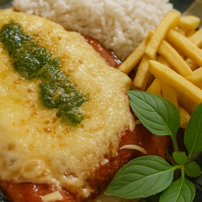 Receita de família feita com carinho: filé mignon frito no ponto certo, molho de tomate caseiro com sabor de tradição, um pesto de manjericão fresco, mussarela e o parmesão gratinados. Arroz branquinho e batata frita crocante completam essa refeição que tem gosto de domingo em casa.