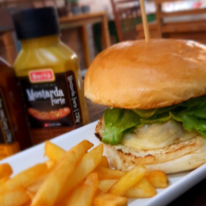 Hamburger artesanal de costela bovina, queijo muçarela, alface, tomate, e maionese da casa, no pão de hamburguer artesanal. Acompanha batata frita