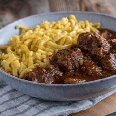 Uma verdadeira iguaria da culinária alemã e suíça: carne bovina em cubos, cozida lentamente com um molho levemente picante e temperos aromáticos, criando uma combinação robusta e intensa de sabores. Acompanhado de Spätzli, o tradicional gnocchi suíço, que absorve perfeitamente os suculentos sabores do molho. Uma refeição completa e aconchegante, ideal para quem busca um prato com um toque autêntico e sabor marcante.