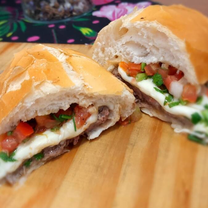 Sanduíche de filé mignon grelhado com queijo muçarela e vinagrete, no