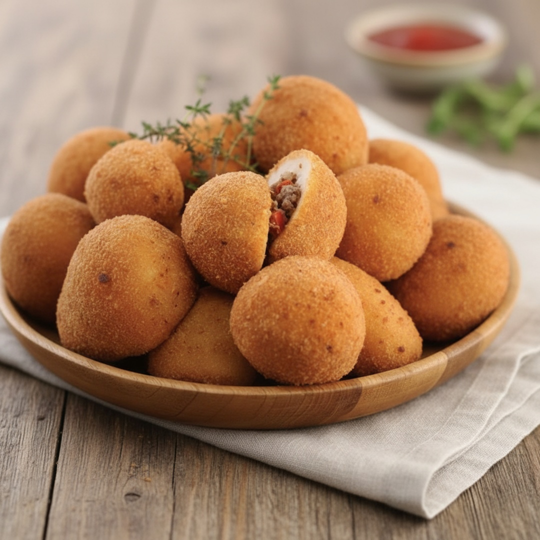 Delicioso bolinho de carne sequinho e crocante recheado com carne moída e tempeiros naturais.