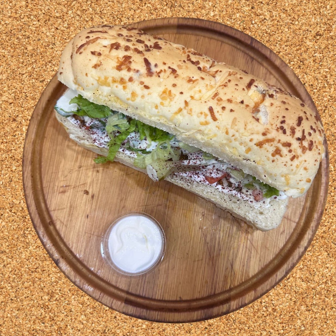 Peito De Frango +carne de kebab+ Molho De Alho + Tomate + Alface + Picles + cebola + Molho De Alho e tahine