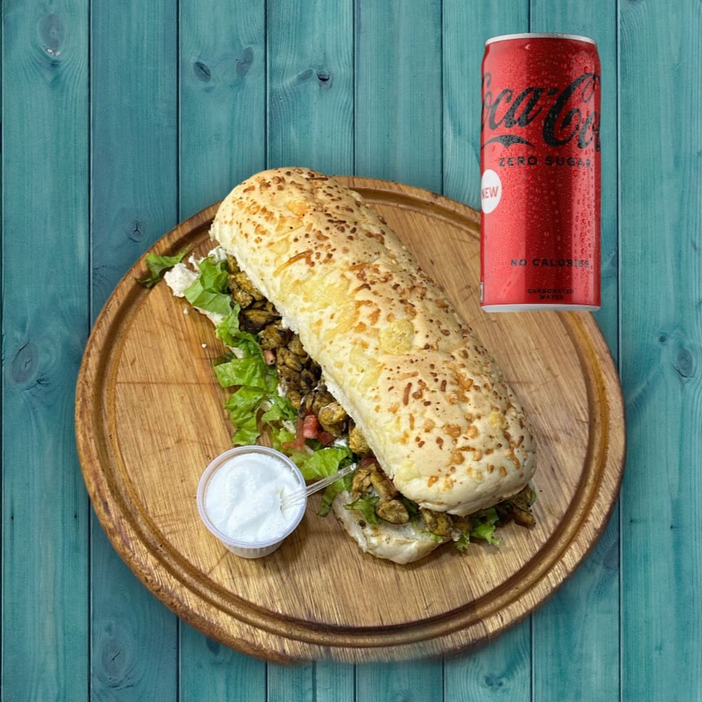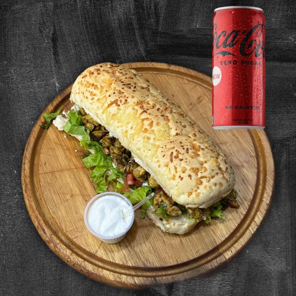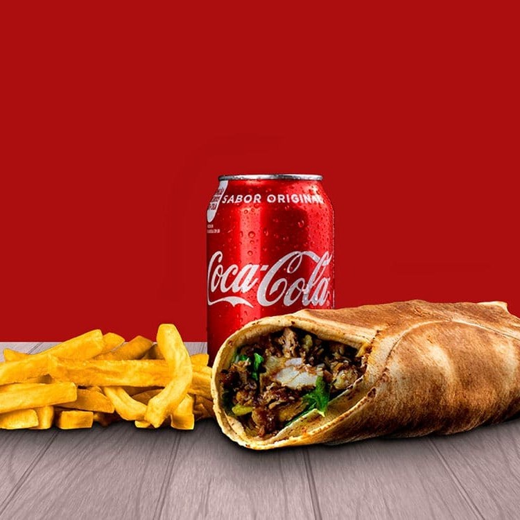 150 gr de ( carne moída, frango) , alface, tomate,cebola, salsinha, molho de tahine e pasta de alho. Com coca zero 355ml