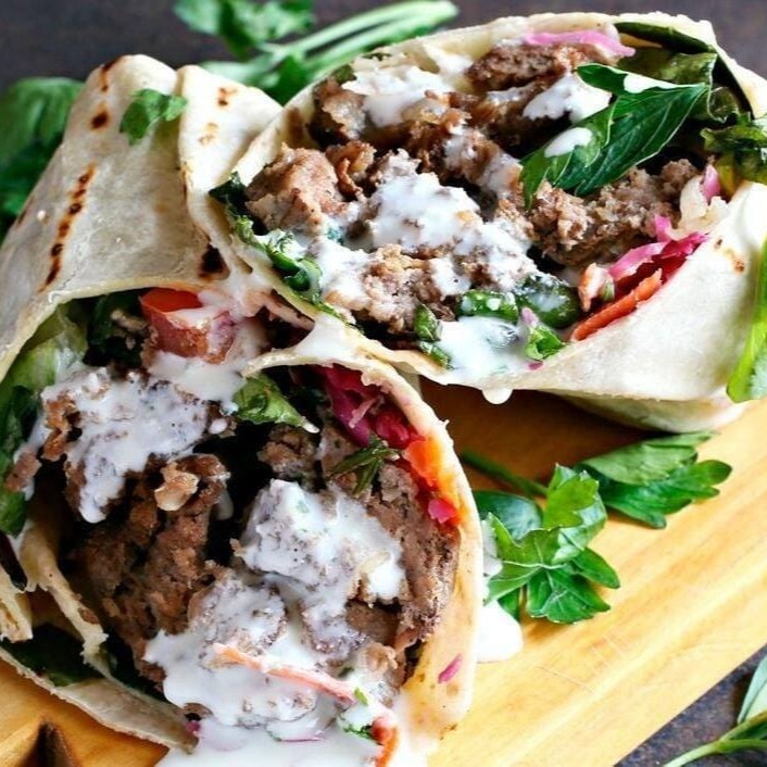 Carne moída com tempero especial 150 gr+ Molho De Tahini + Cebola + Salsinha + Alface + Tomate + Molho De Roma+ pasta de alho /tamanho grande , Cortada Em 4 Pedacos