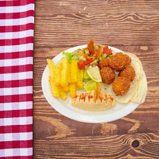 6 Bolinhas De Falafel + Salada + Pão + Pasta + Batata