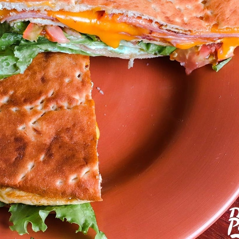 filé de frango, queijo prato, tomate, alface e maionese no pão sirio.