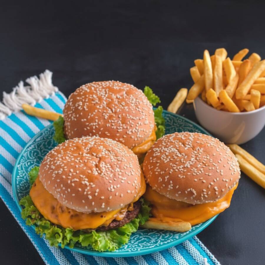 Hambúrguer, queijo prato, tomate, alface e maionese no pão de hambúrguer (acompanha mini porção de batata)