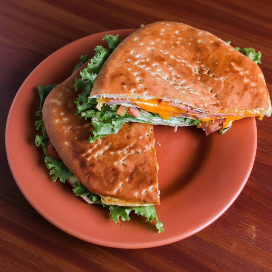 Calabresa fatiada, presunto, queijo prato, tomate, alface e maionese no pão sírio
