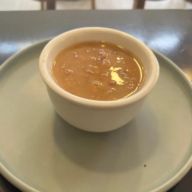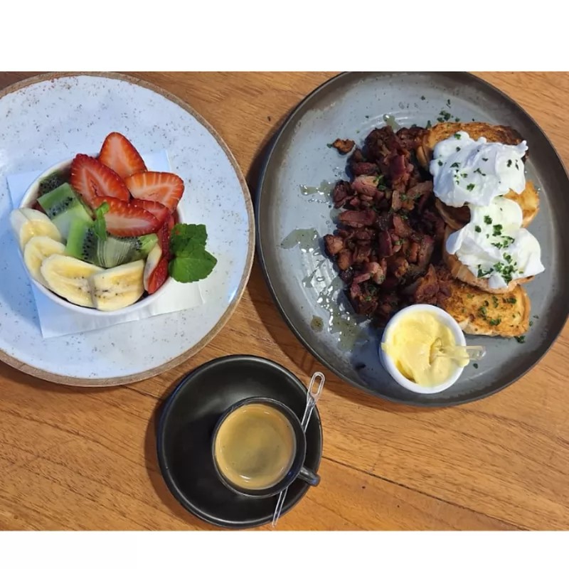 Ovo mechido, bacon, pão tostado e manteiga + café expresso e salada de frutas