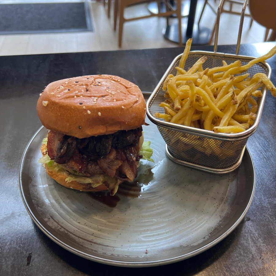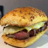 Queijo mussarela, bacon mix de folhas, cebola caramelizada molho da casa no pão de brioche pincelado de gergelim.