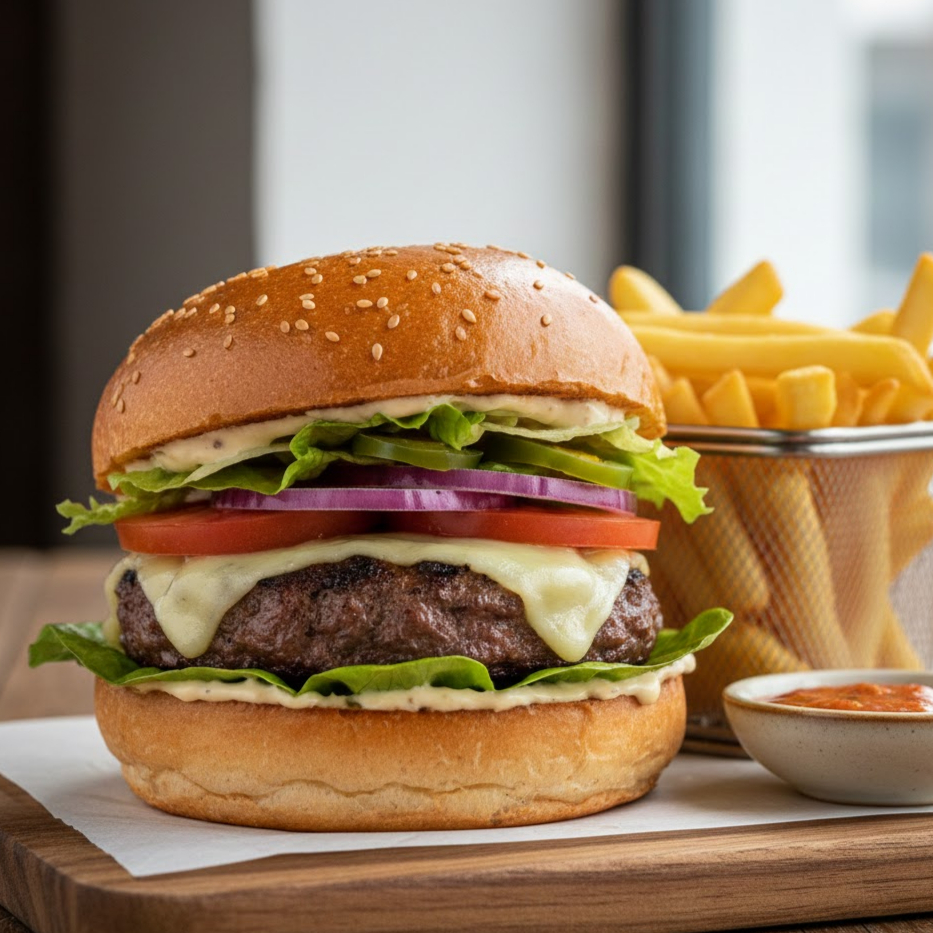 Pão brioche, hambúrguer angus 180gr, queijo prato, pimenta jalapeño, alface americana, tomate, cebola roxa e maionese da casa. Acompanham fritas e molho da casa