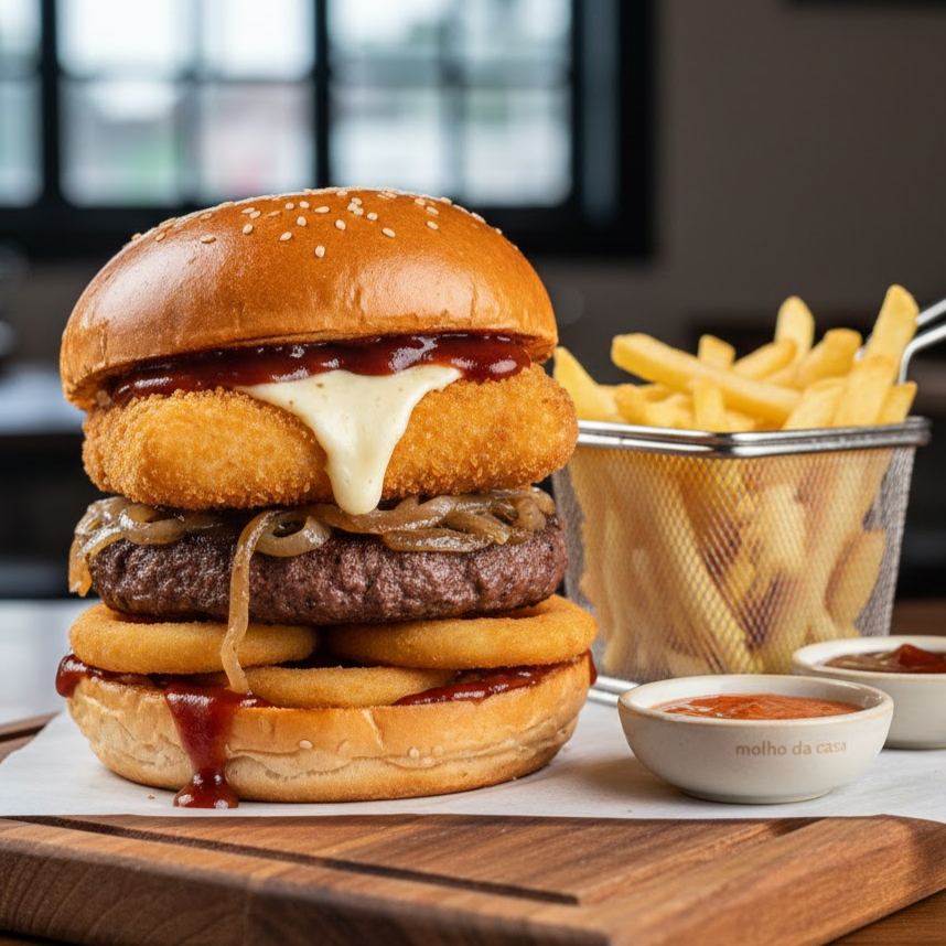 Pão brioche, hambúrguer angus 180gr, cebola caramelizada, requeijão empanado, onion rings e molho barbecue. Acompanham Fritas e molho da casa