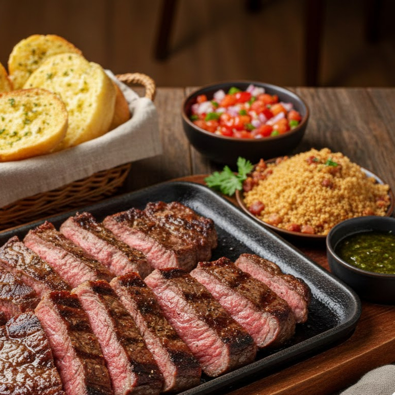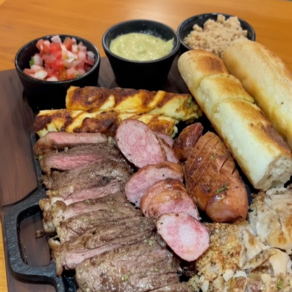 Carne, Frango, Linguiça Apimentada, Queijo Coalho e um Pão de Alho ( Acompanha Vinagrete, Farofa)