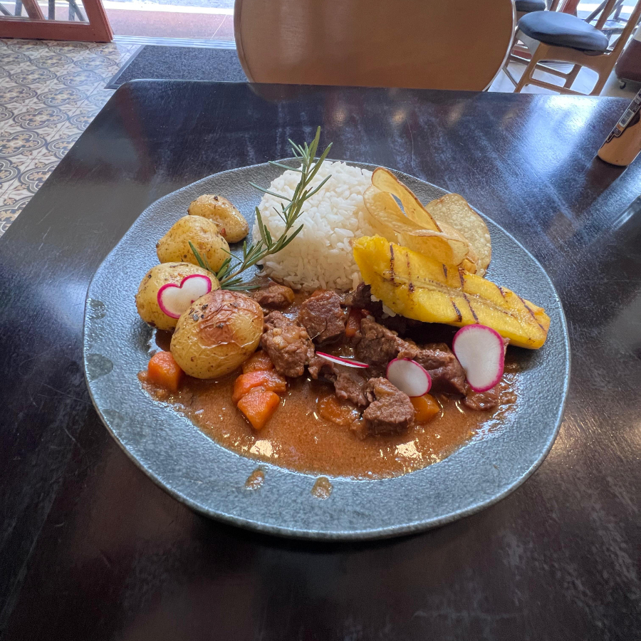 Picadinho de carne com batata bolinha banana da terra na manteiga de garrafa e arroz branco.
