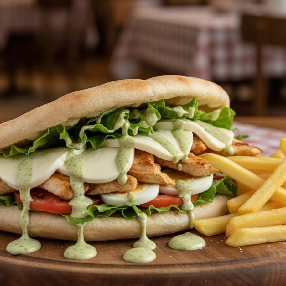 pão sírio, filé de frango, muçarela, alface, ovo, tomate e molho da casa