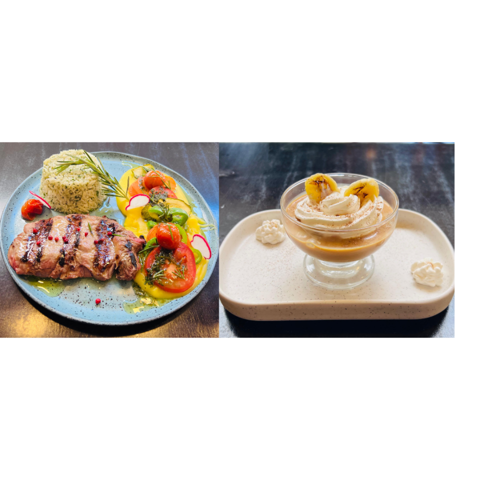 Bife ancho na parrilla com ratatouille com purê de mandioquinha e arroz verde ... Acompanha saladinha e sobremesa do dia