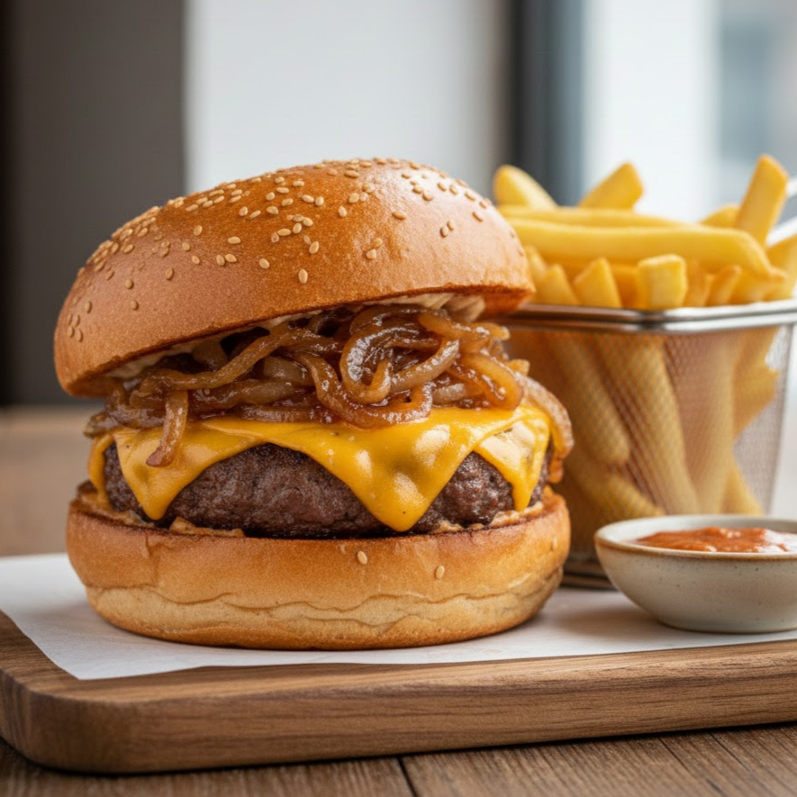 Pão brioche, hambúrguer angus 180gr, cheddar e cebola caramelizada. Acompanham Fritas e molho da casa.