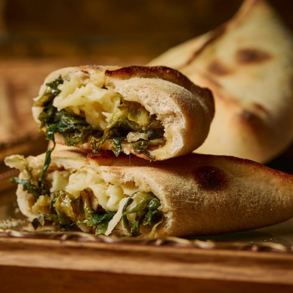 Massa macia e crocante, recheada com escarola refogada e queijo mussarela derretido, criando uma combinação deliciosa de sabores leves e cremosos.
