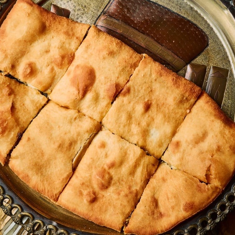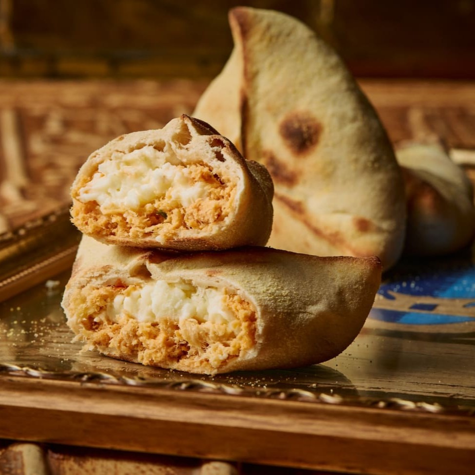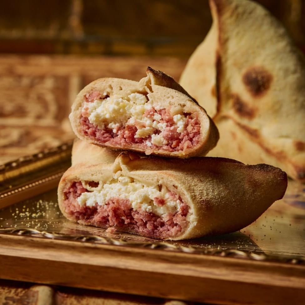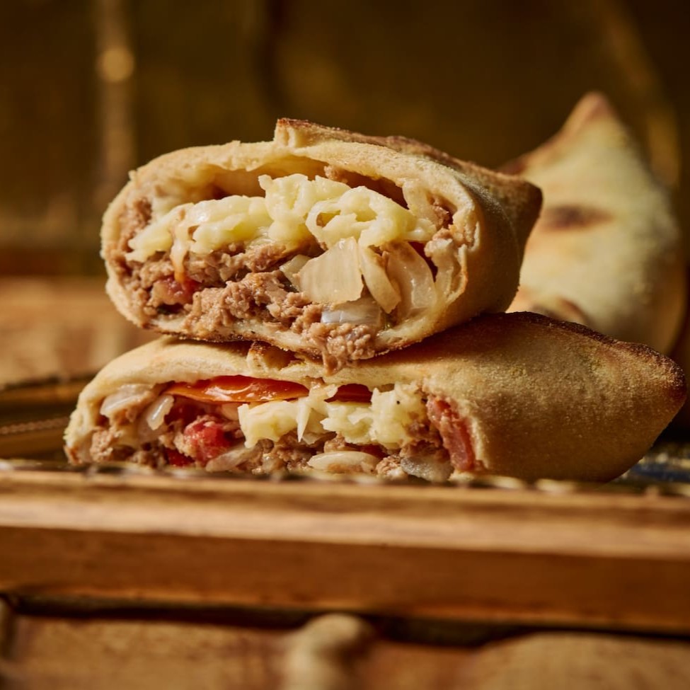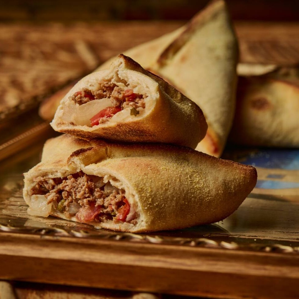Massa macia e levemente crocante, recheada com carne moída temperada com especiarias e ervas, criando uma combinação suculenta e cheia de sabor.