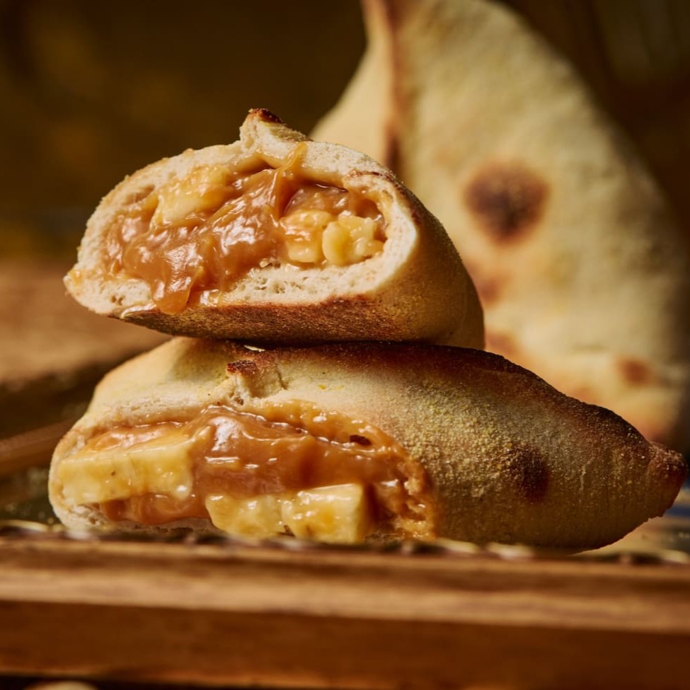 Massa macia e suave, recheada com doce de leite cremoso e banana caramelizada, criando uma combinação doce e deliciosa.