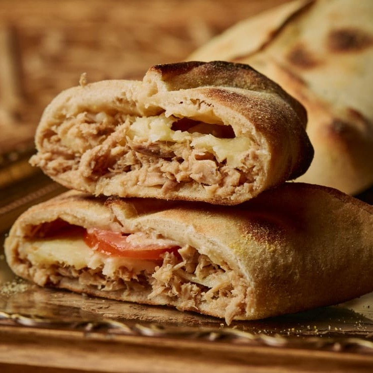 Massa macia e crocante, recheada com atum desfiado, queijo mussarela derretido, tomates frescos e um toque de orégano.