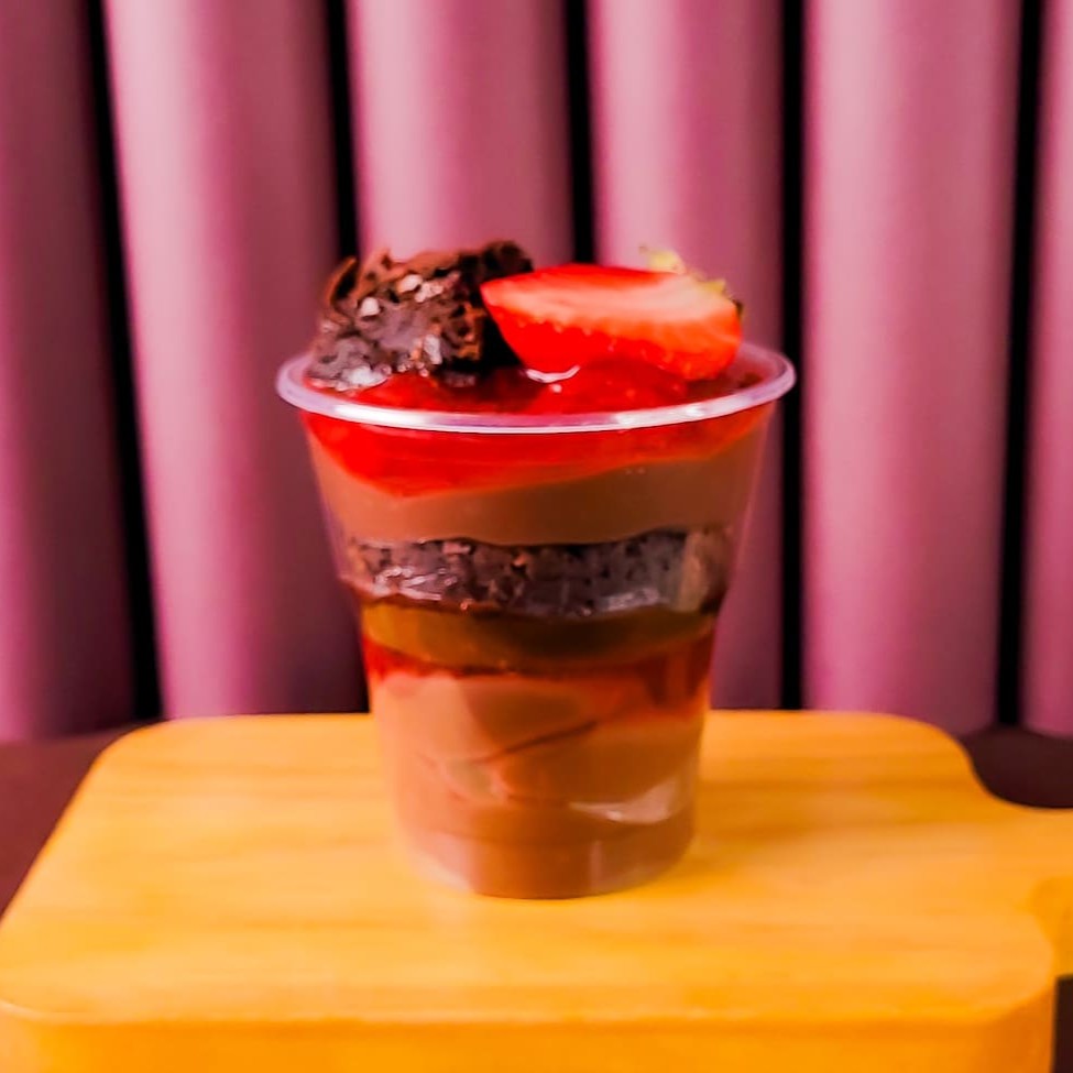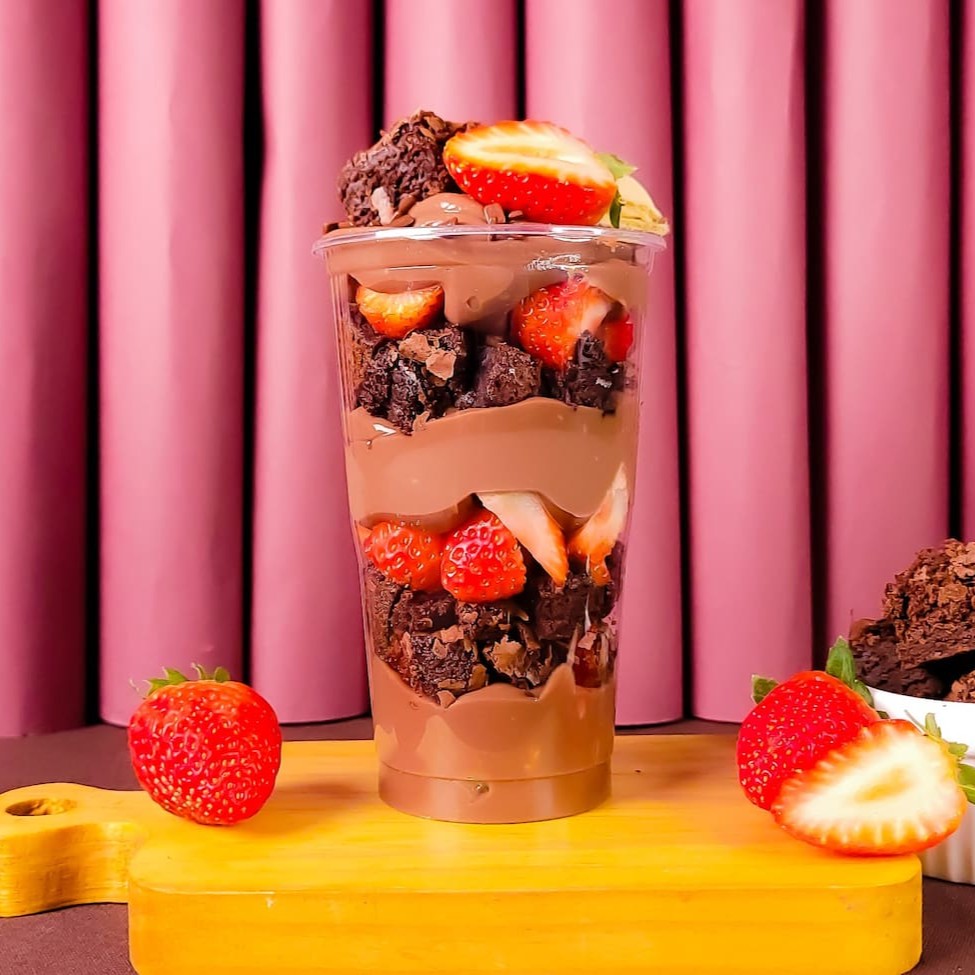 Creme de chocolate, brownie e compota de morango com pedaços. Finalizado com morangos frescos e brownie por cima!
