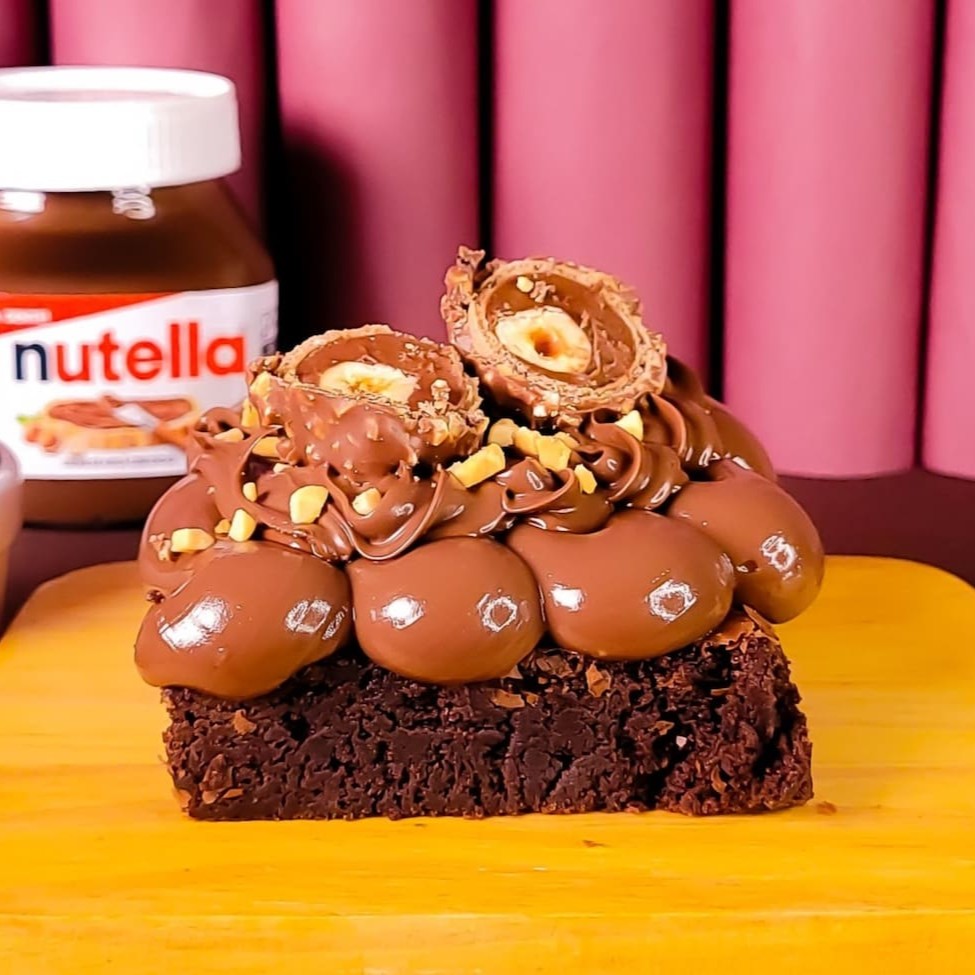 Brownie macio com creme de chocolate, Nutella, amendoim crocante e Ferrero Rocher. Um luxo em cada mordida!