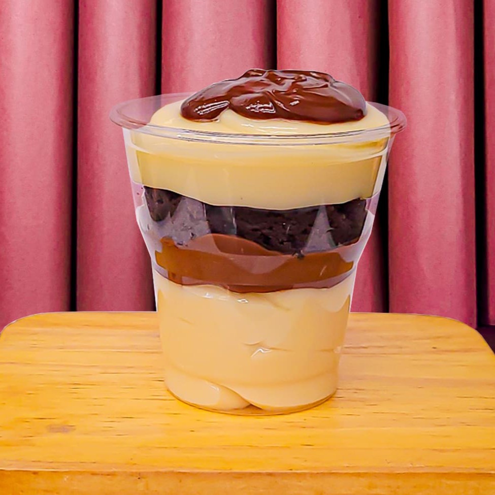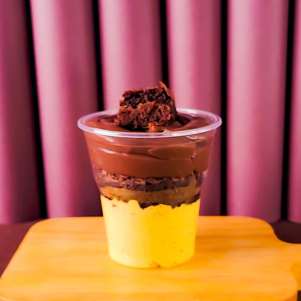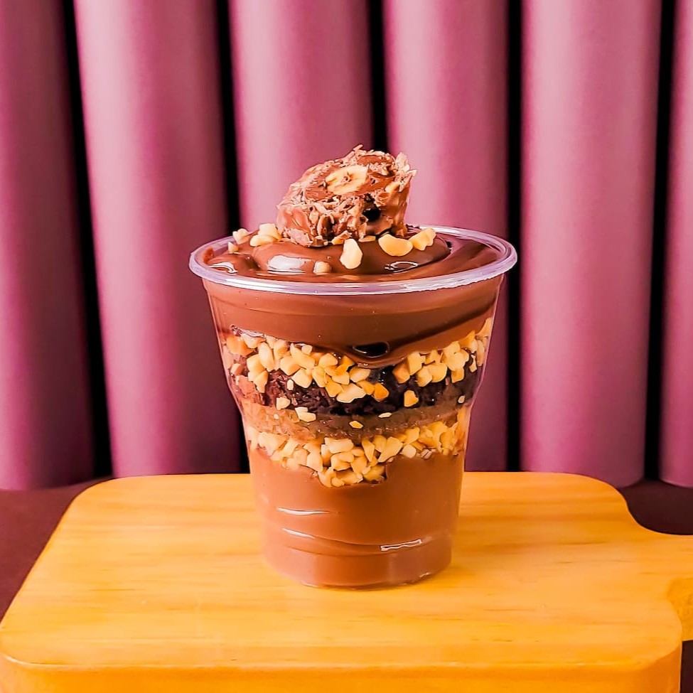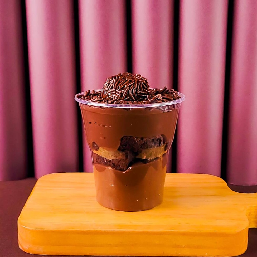 Creme de chocolate, brownie, granulado e brigadeiro. Um copo feito para os chocólatras