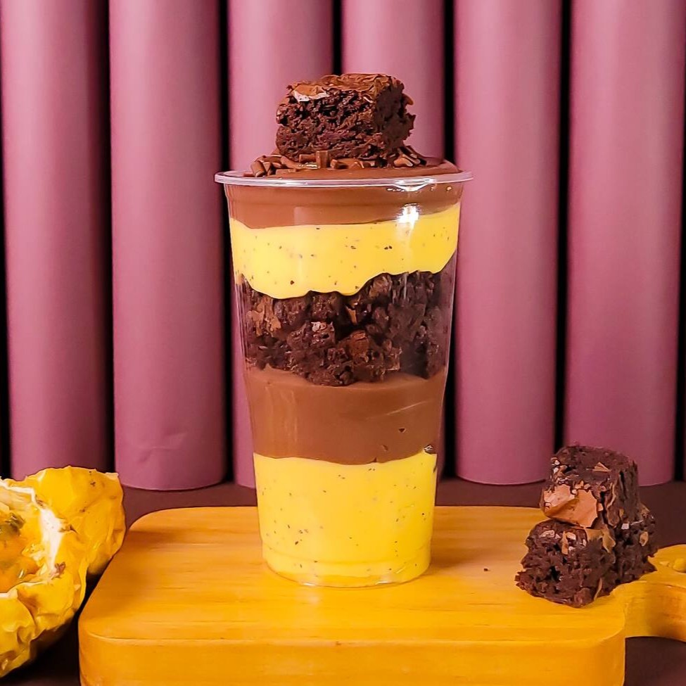 Creme de maracujá, creme de chocolate e pedaços de brownie. Um copo cheio de contraste e sabor!