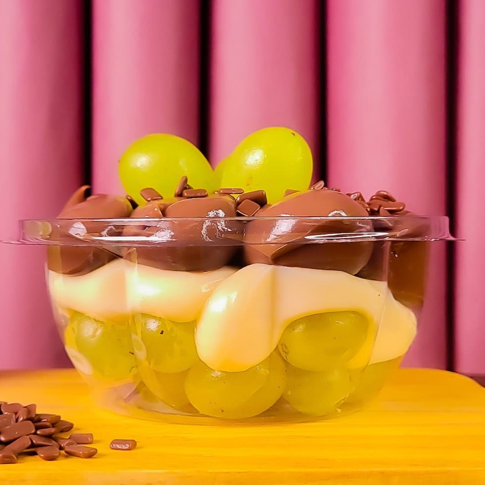 Uvas frescas, coberto com um delicioso creme de Ninho e cobertura de creme de chocolate. Leve, doce e viciante!