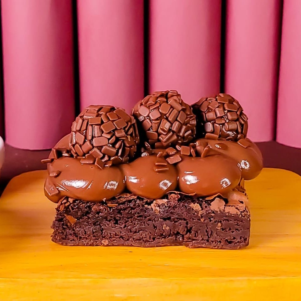 Brownie fresquinho coberto com creme de chocolate e finalizado com brigadeiro belga de chocolate ao leite. Uma explosão de sabor para quem ama chocolate de verdade!