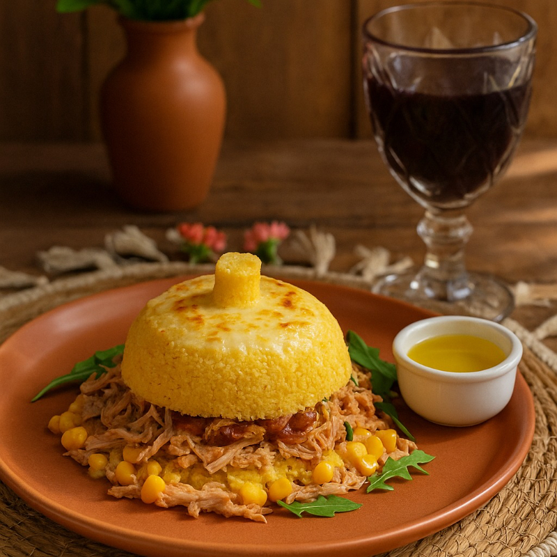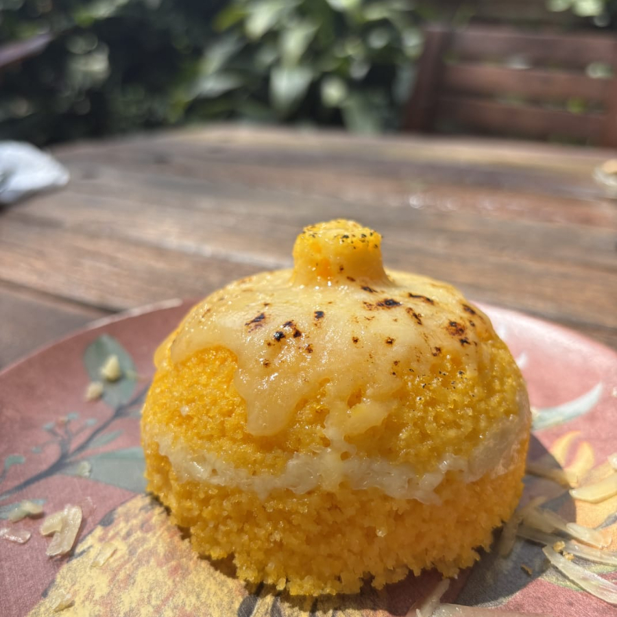 cuscuz fofinho (massa da bahia, direto da cooperativa de pequenos agricultores, não transgênico) com recheio de frango desfiado, queijo coalho e creme de milho