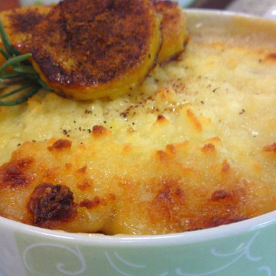 purê de mandioca, leite de coco, frango desfiado, queijo parmesão