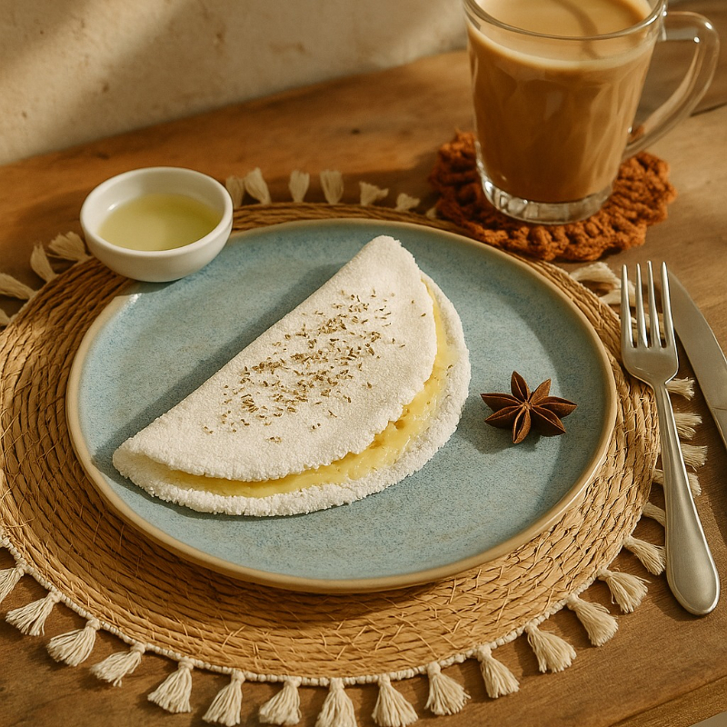 tapioca de massa artesanal fofinha (trazida da bahia) com recheio de carne seca, banana da terra, queijo coalho