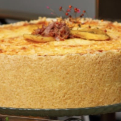 purê de mandioca, leite de coco, carne seca desfiada, queijo parmesão