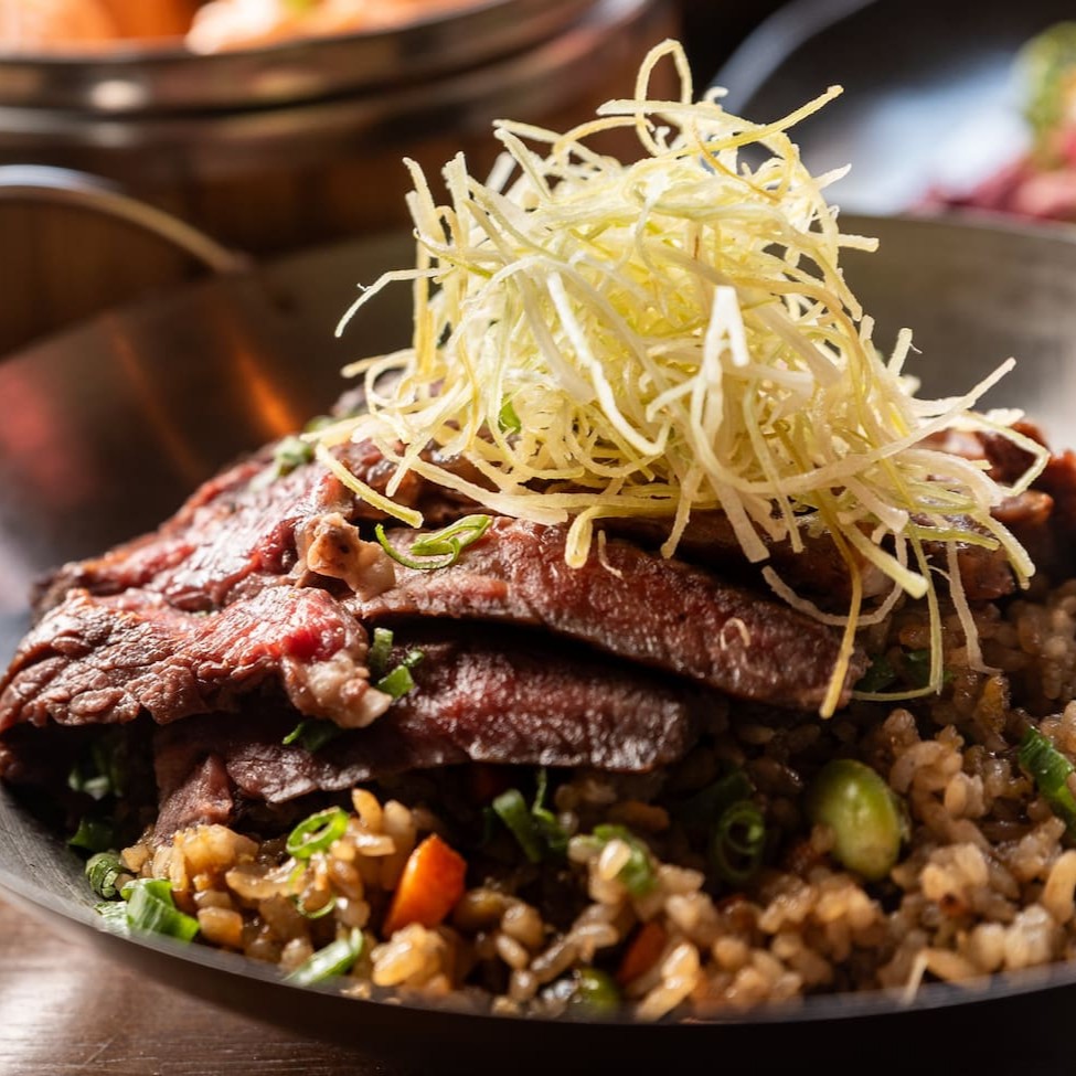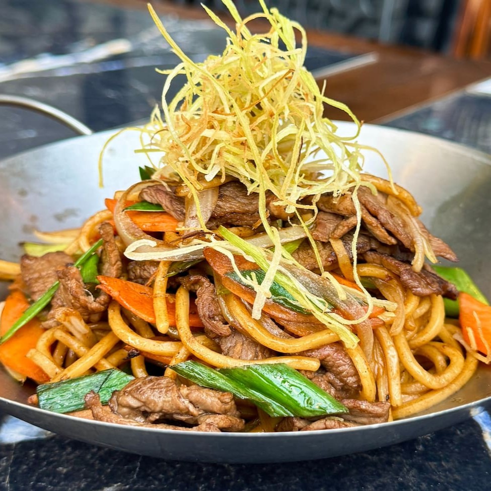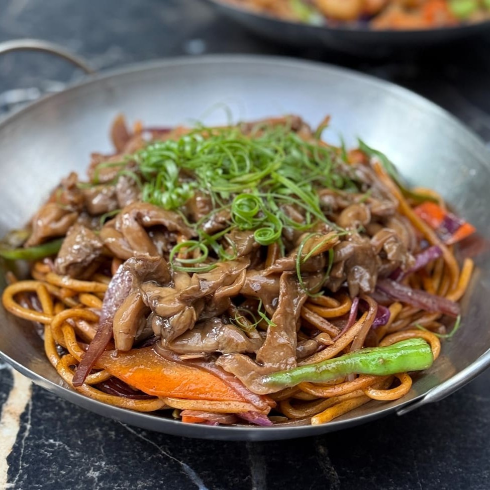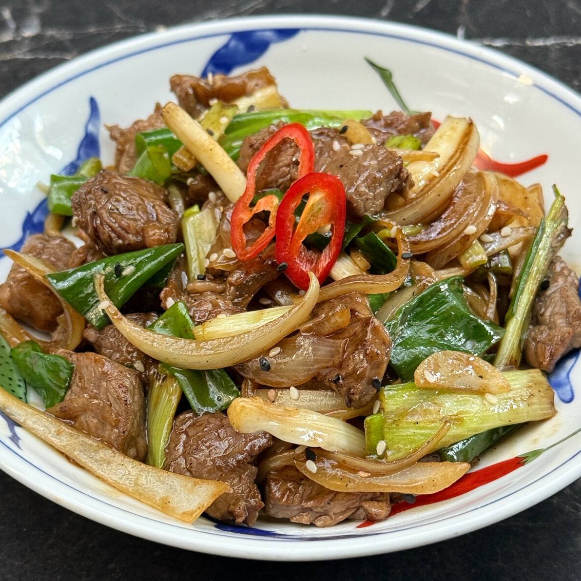 Carne bovina salteada na wok com cebola e cebolinha, e molho a base se shoyu e uma porcão de Gohan.