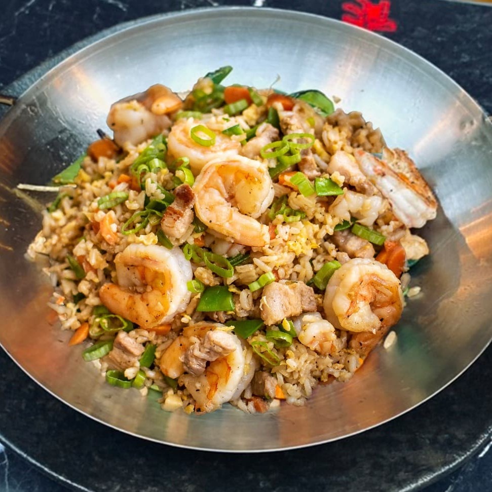 Bife ancho grelhado , arroz salteado na wok com ovos e legumes
