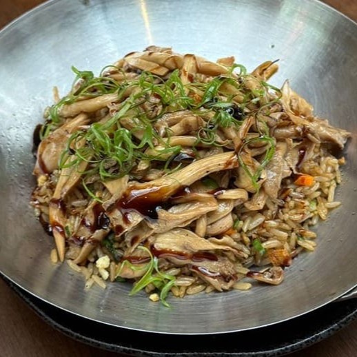 Sobrecoxa salteada na wok com pimenta Kung Pow, amendoim, gengibre e cebolinha e uma porcão de Gohan..