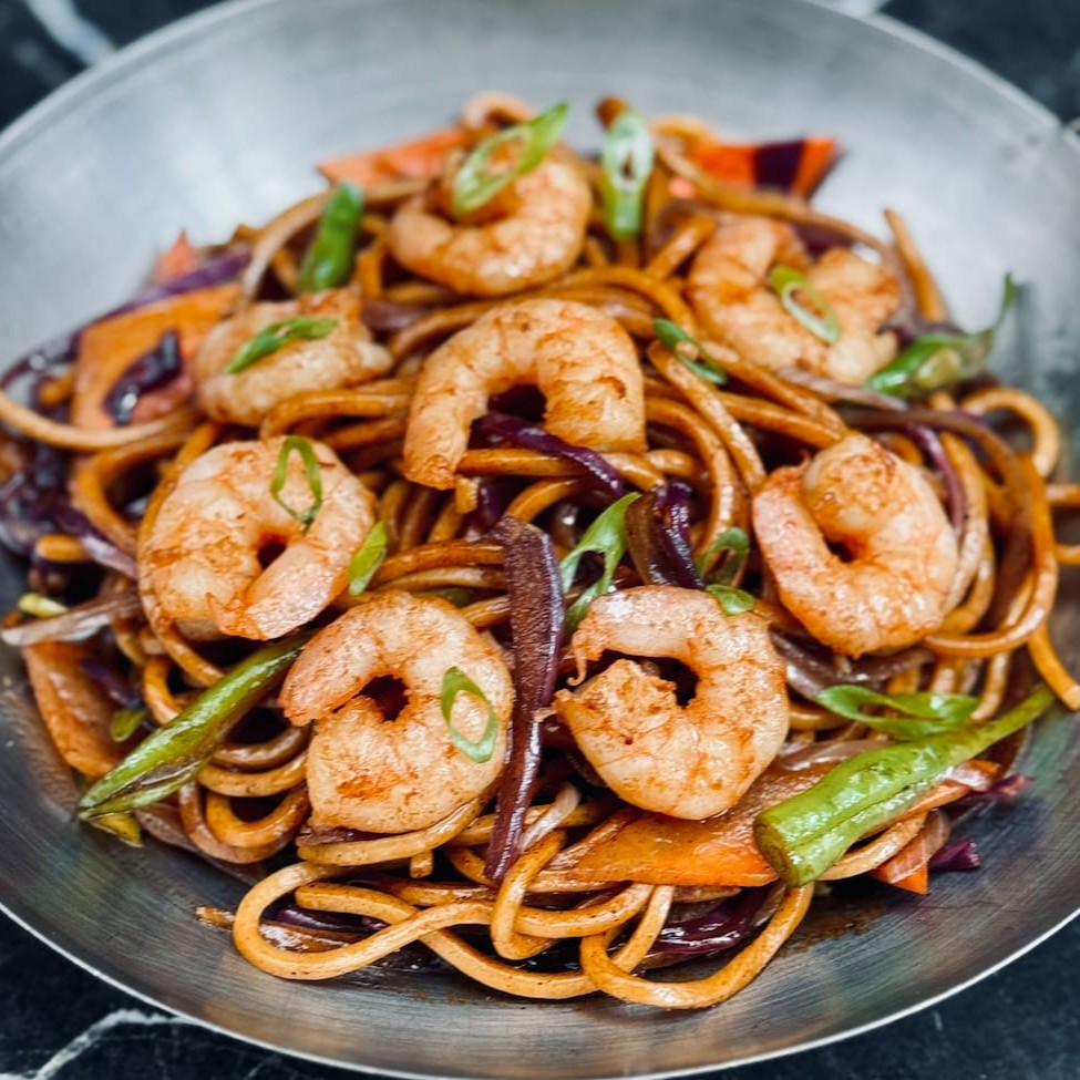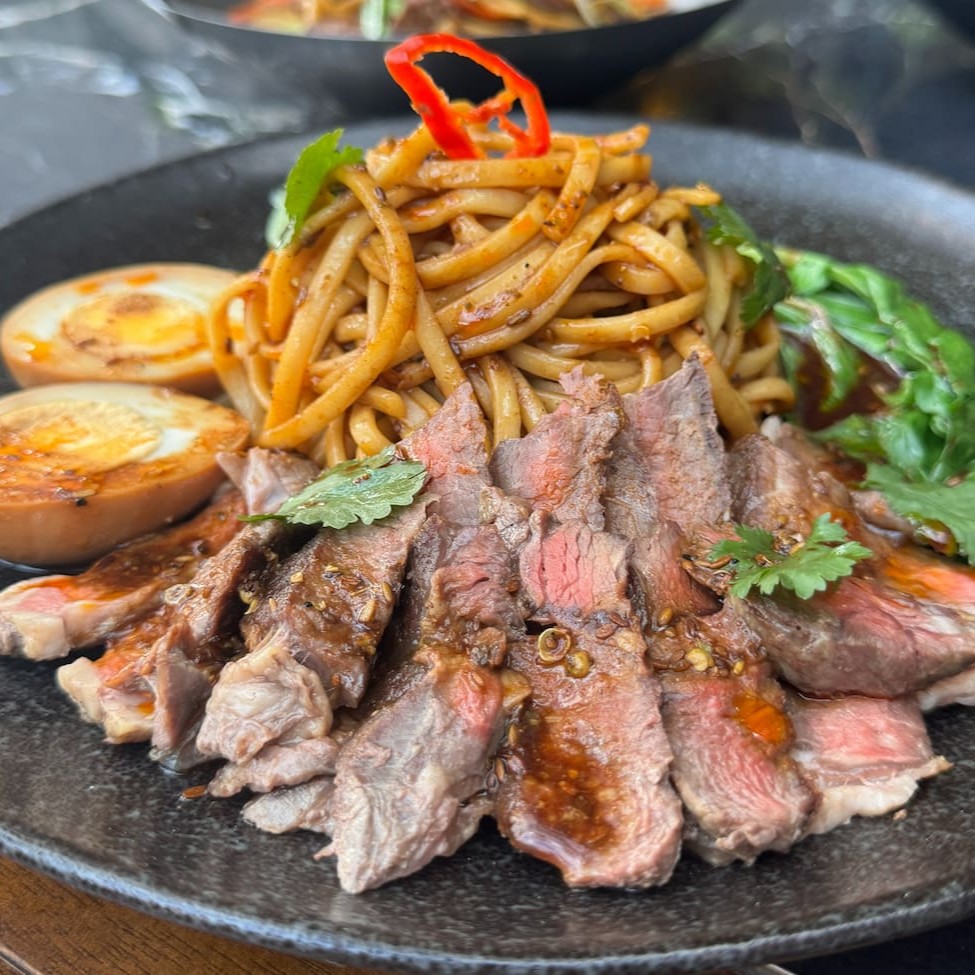 Noodles ao óleo de especiarias e pimenta Sichuan, bife ancho grelhado , ovo marinado e bokchoy