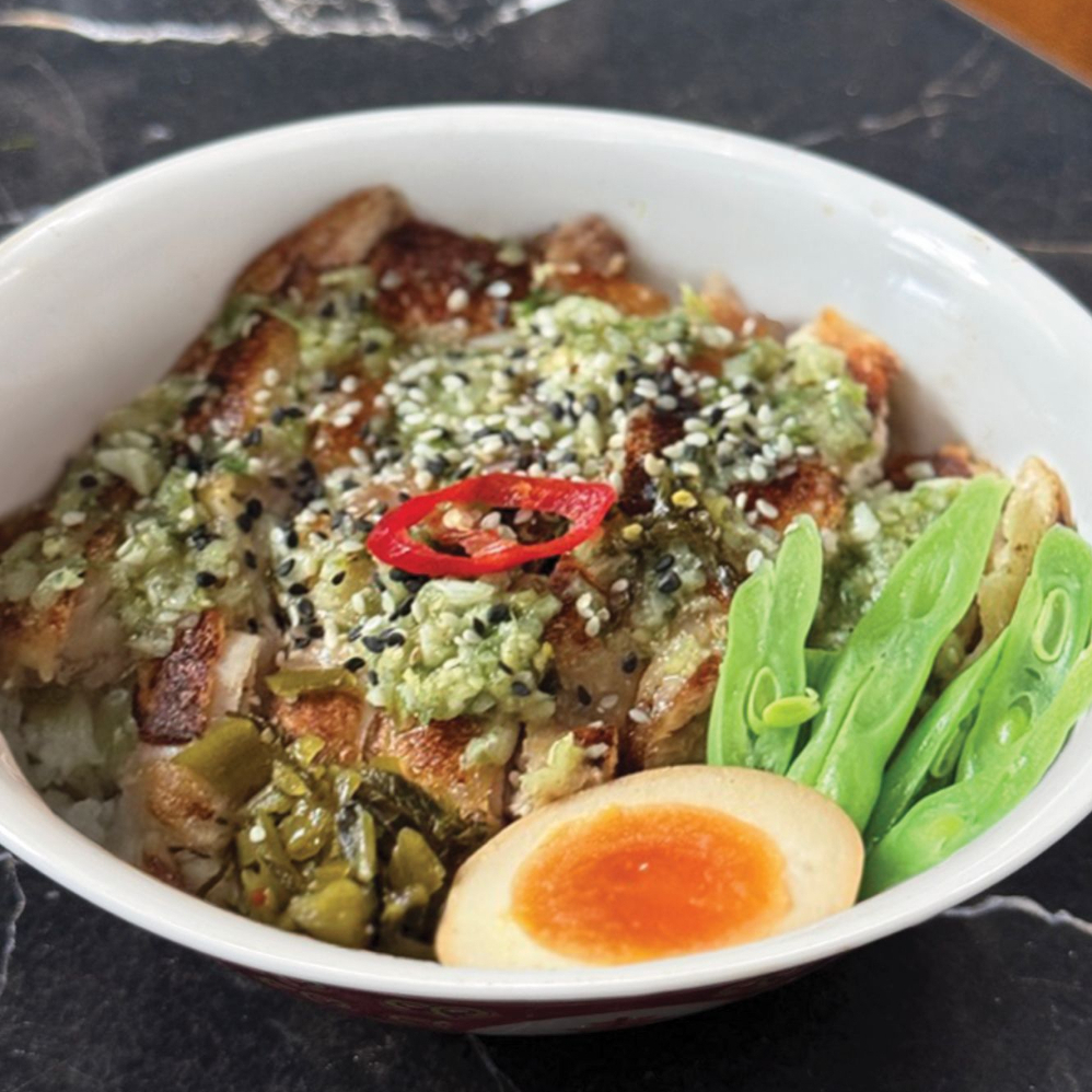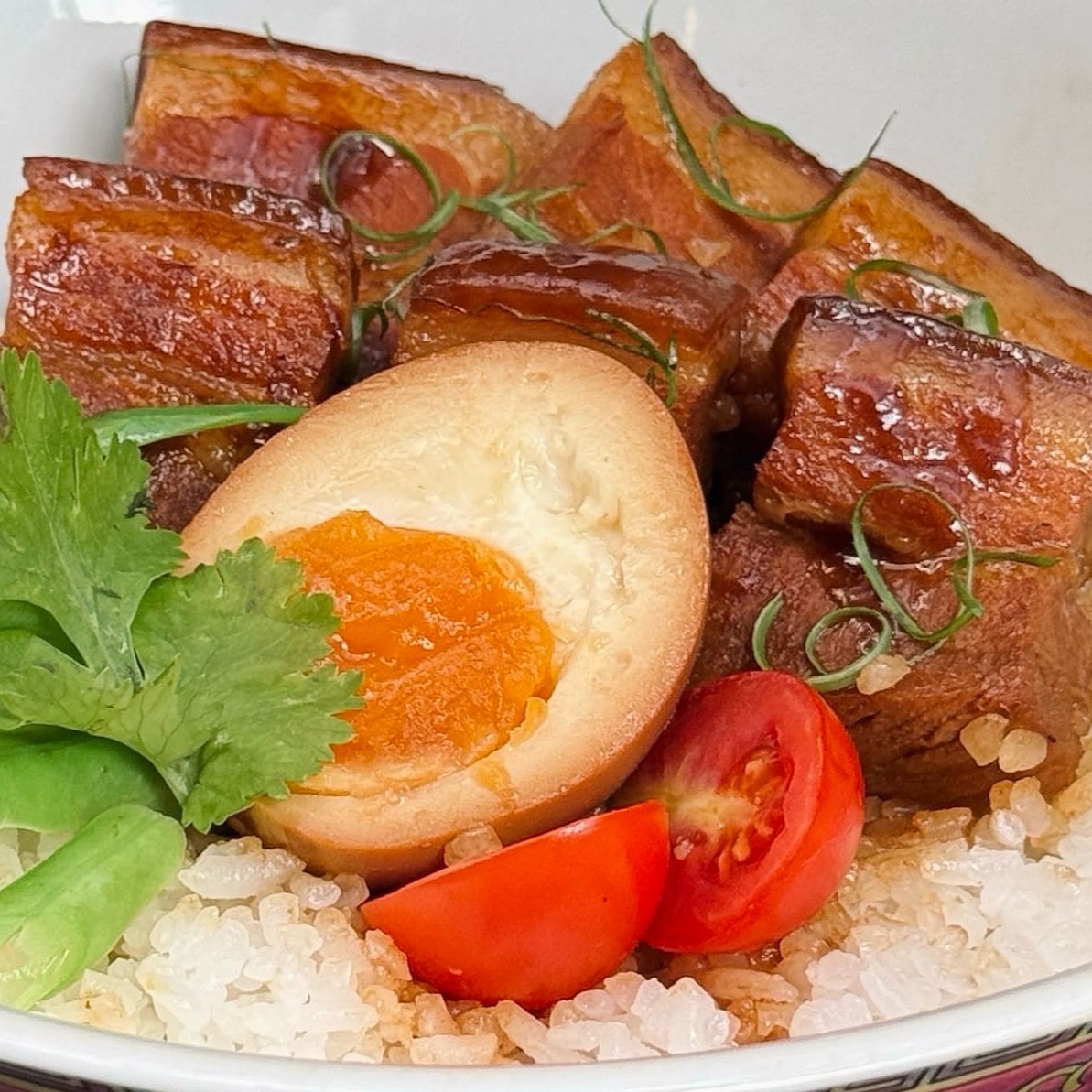 Tradicional bowl Taiwanês que leva carne de porco com molho, folha de mostarda em conserva, ovo mollet marinado, vagem e tomates-cereja, sobre cama de arroz