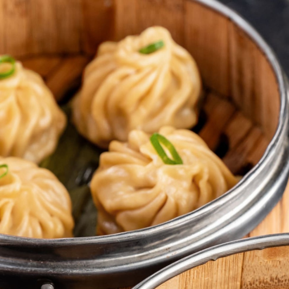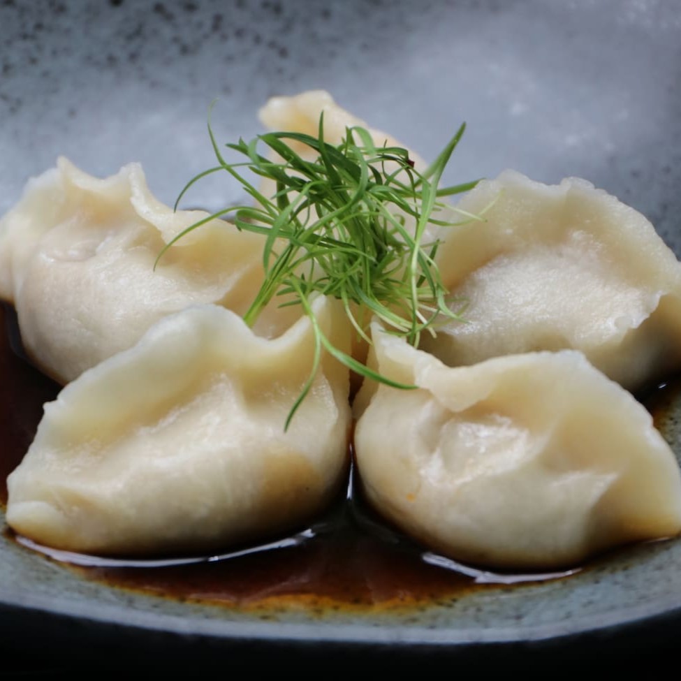 Gyoza de carne bovina e nirá, molho de shoyu temperado.