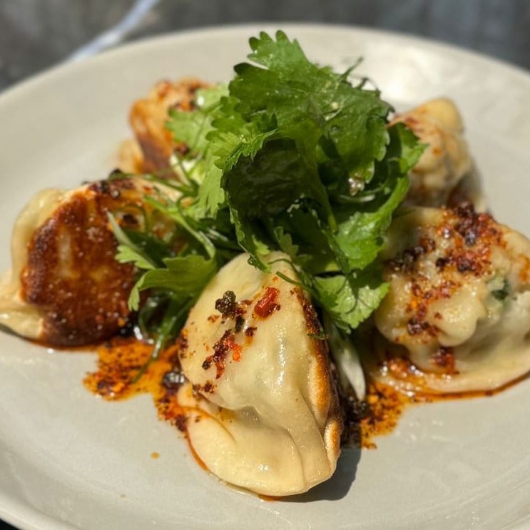 Gyoza de carne bovina e nirá grelhado, molho cítrico de gergelim e Chilli Crunch.