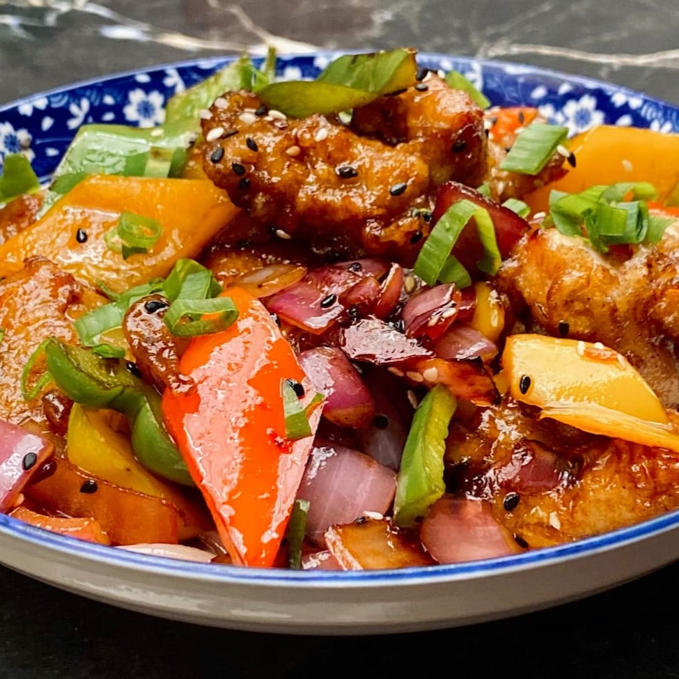 Frango empanado, salteado na wok com com pimentão, cebola e molho agridoce e uma porcão de Gohan.