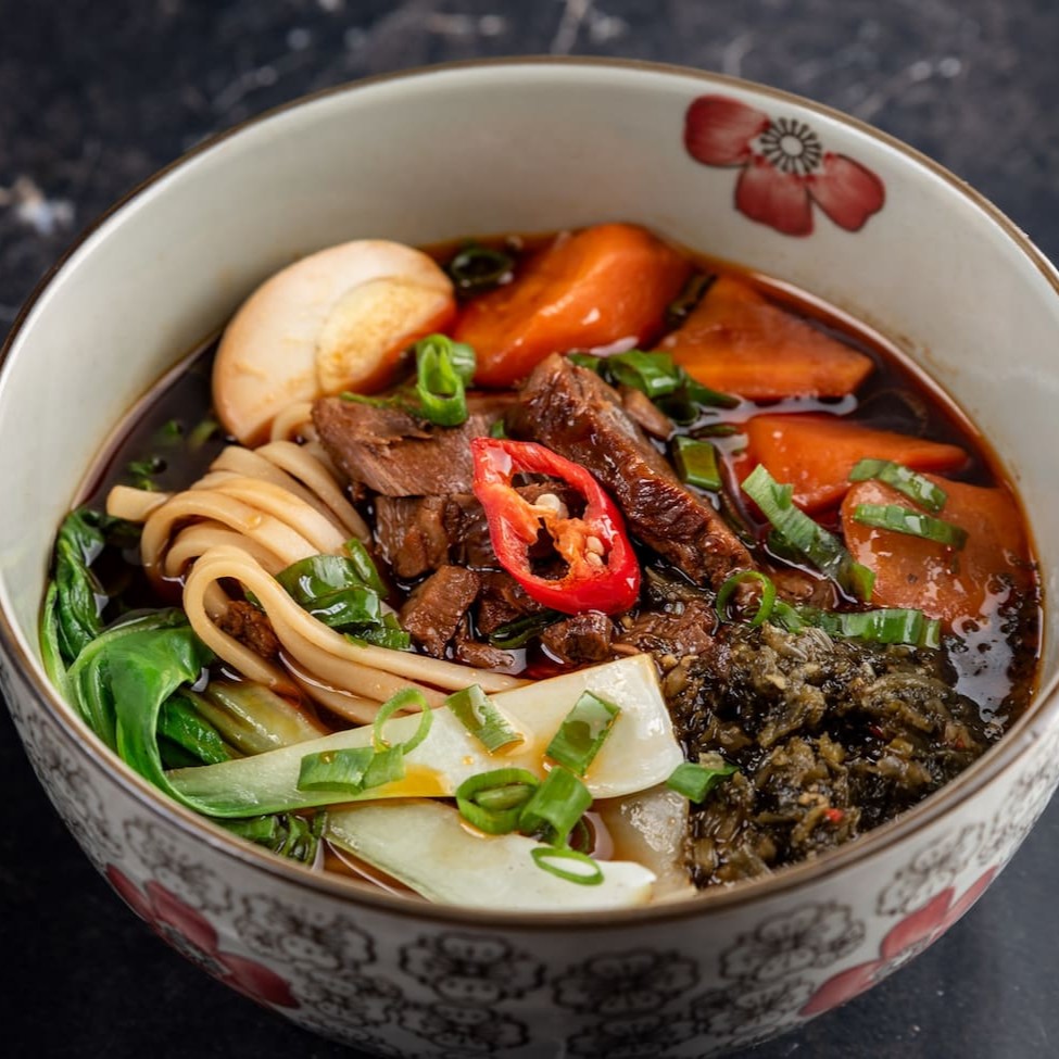Macarrão com caldo, carne bovina, bokchoy, cenoura, ovo marinado, picles de folha de mostarda, cebolinha, coentro e Chilli Oil