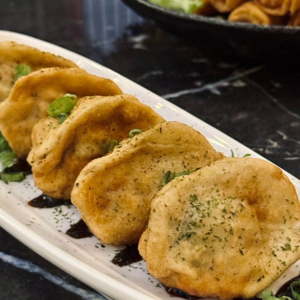 Gyoza de carne bovina e nirá, finalizado com tarê e flocos de nirá. Recomendamos esquentar na air-fryer :)