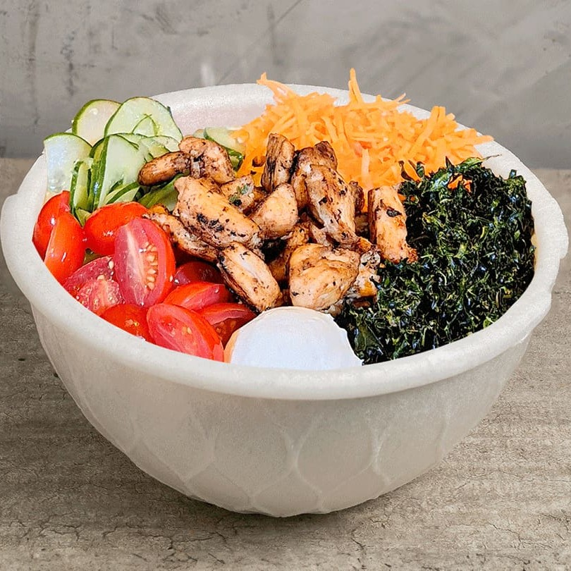 Frango grelhado, arroz japonês, molho ponzu, sunomono, cenoura, tomate cereja, cream cheese e crisp de couve. Não substituímos ingredientes, apenas retiramos. Molho já incluso no bowl, não é enviado à parte. Total aproximado da porção, 410g.