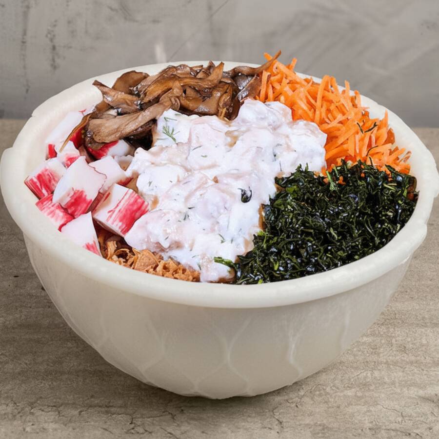 Salmão marinado, shimeji grelhado, arroz japonês, molho ponzu (shoyu, óleo de gergelim, limão, gengibre, alho e pimenta sriracha), abacate, cenoura, kani, sunomono e crisp de couve. Não substituímos ingredientes, apenas retiramos. Molho já incluso no bowl, não é enviado à parte. Total aproximado da porção, 410g.