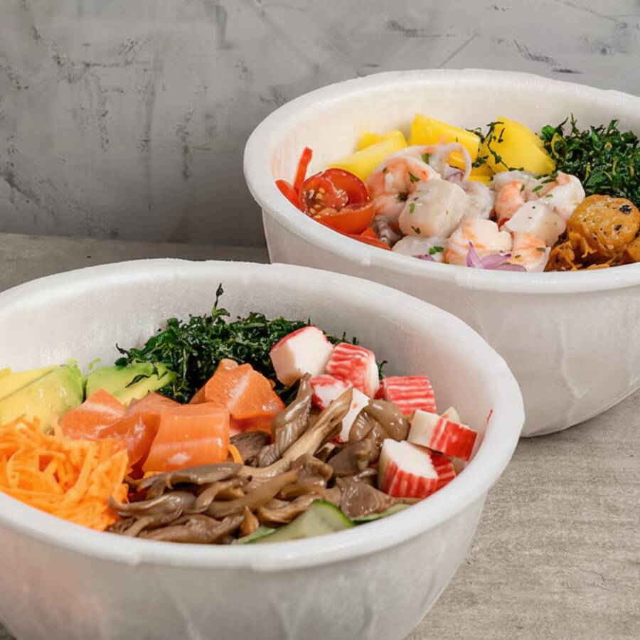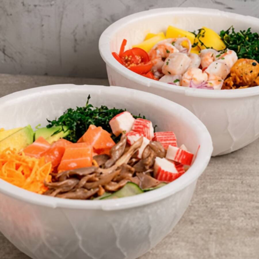 Monte um poke do seu jeito! Escolha 1 base, 2 proteínas, molho e 5 acompanhamentos. Total aproximado da porção, 410g.