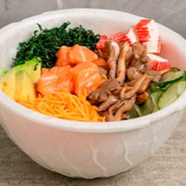 Salmão marinado, shimeji grelhado, arroz japonês, molho ponzu (shoyu, óleo de gergelim, limão, gengibre, alho e pimenta sriracha), abacate, cenoura, kani, sunomono e crisp de couve. Não substituímos ingredientes, apenas retiramos. Molho já incluso no bowl, não é enviado à parte. Total aproximado da porção, 410g.